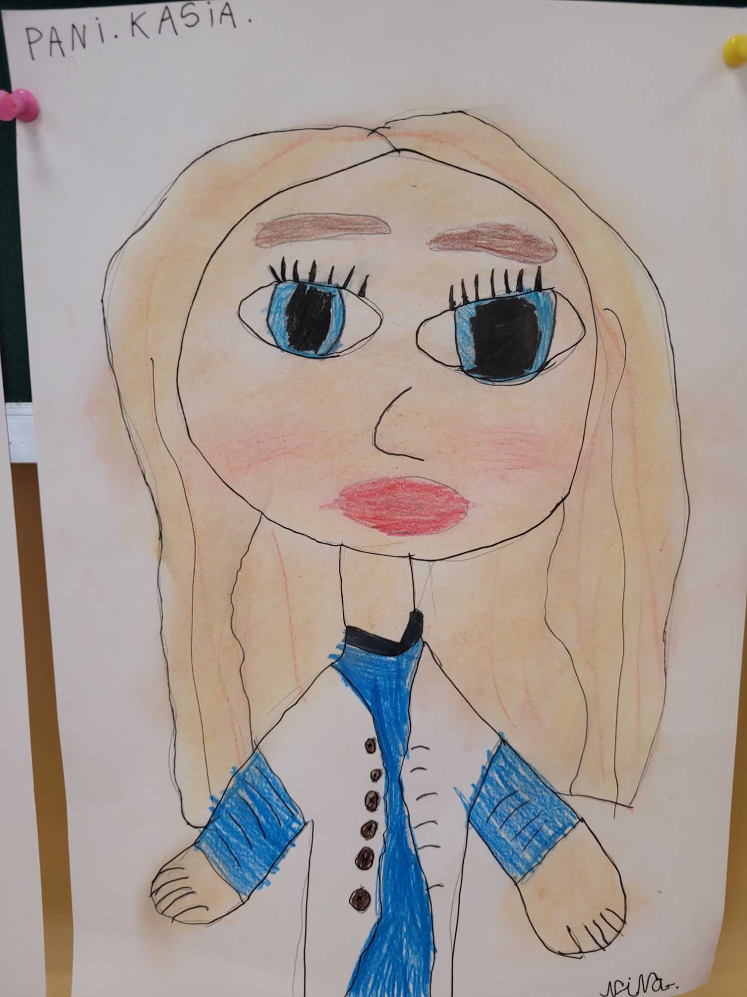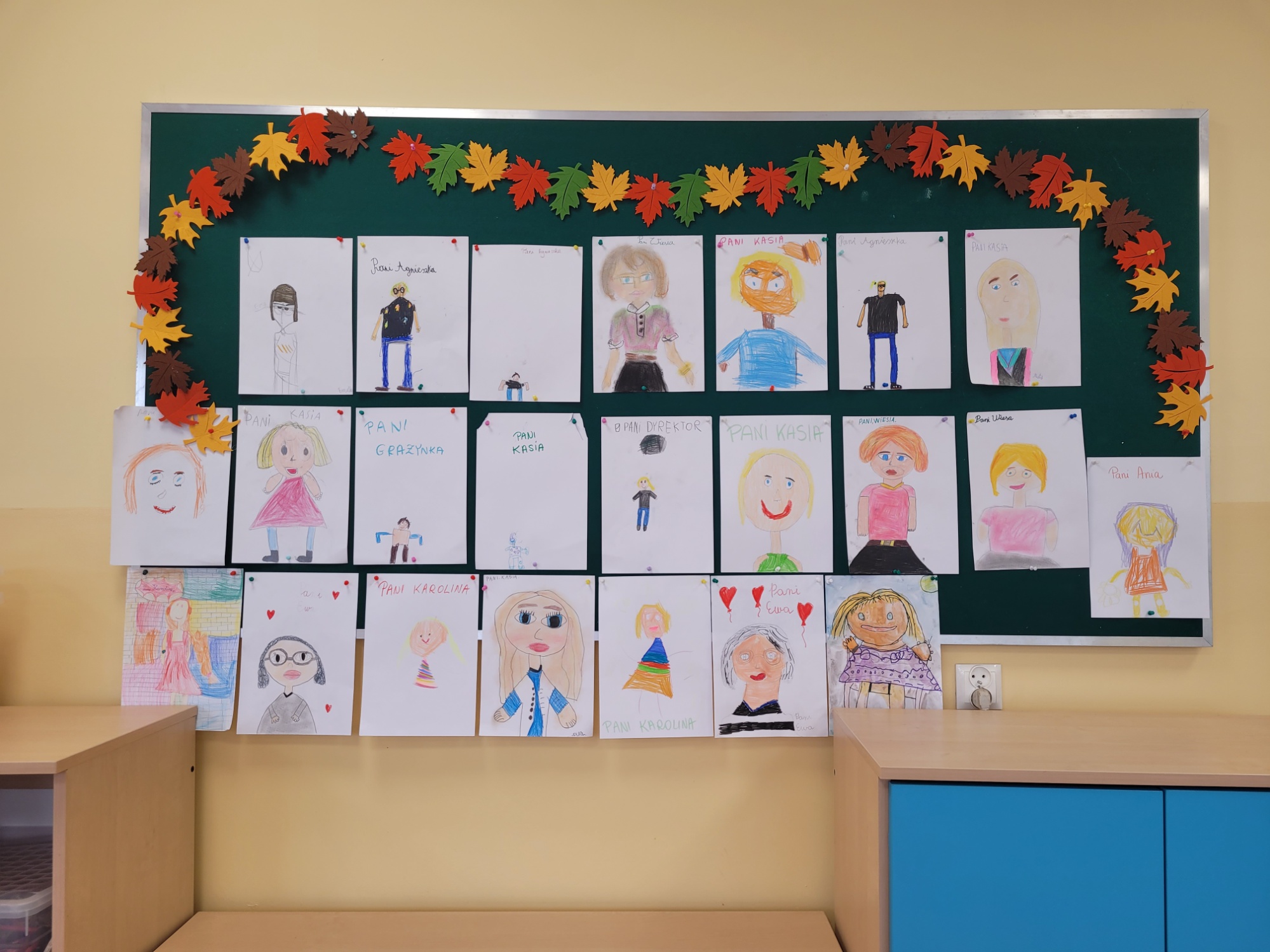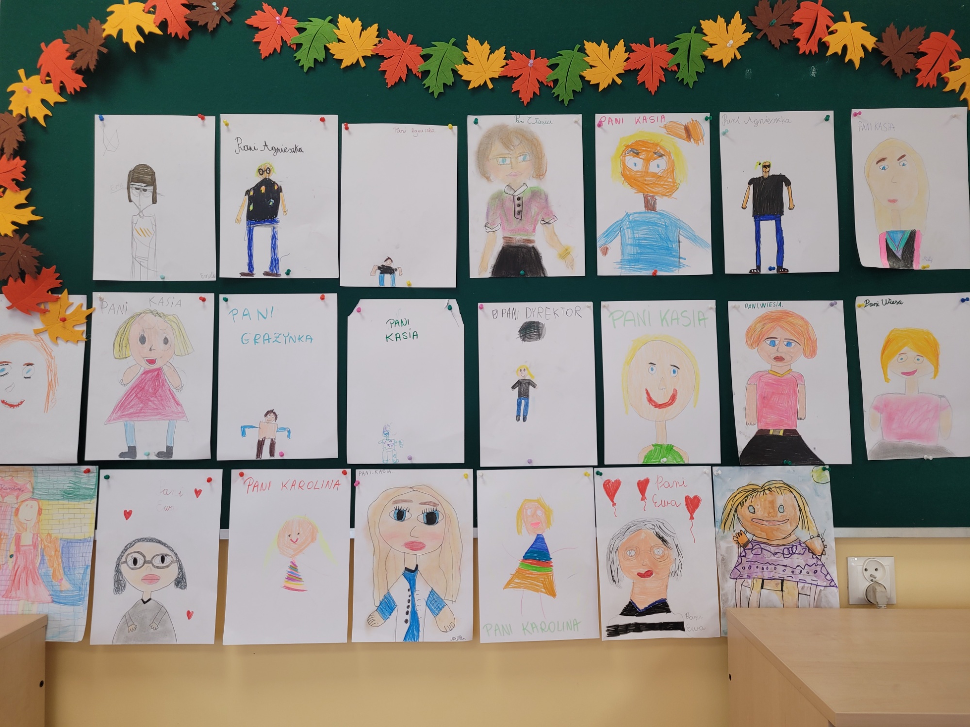 - Z okazji Dni Edukacji Narodowej uczniowie przygotowali portrety nauczycieli. Mogliśmy podziwiać je na gazetce w sali świetlicy. Cieszymy się, że uczniowe widzą nas w samych kolorowych barwach.