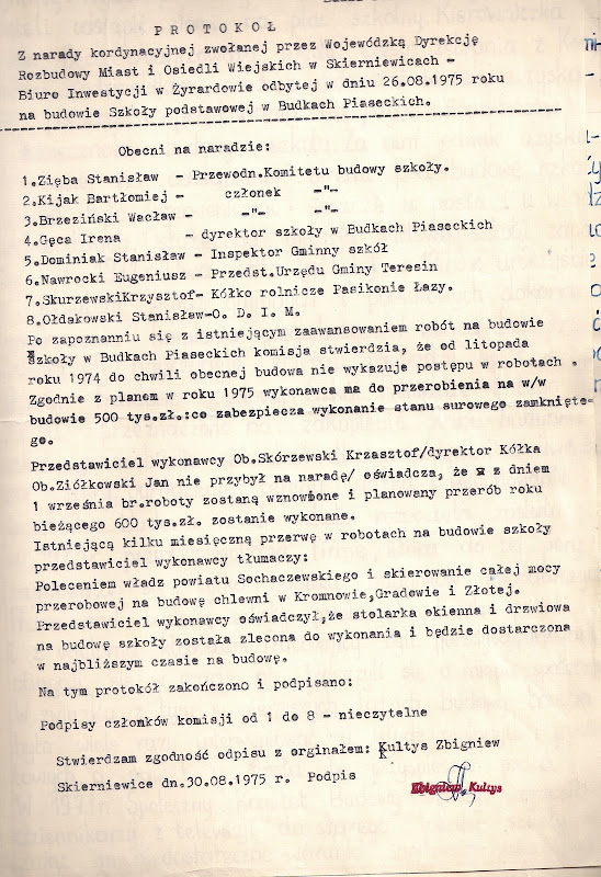 dopiero wtedy władze zgodziły się na budowę nowego budynku .Nie znaczy to ,że skończyły się kłopoty ,otórz wkrótce wyniknęły nowe kłopoty .Niektórzy mieszkańcy Wsi nie chcieli odstąpić ziemi pod budynek szkoły .Irena Gęca organizowała wtedy często zebrania Komitetu Rodzicielskiego w celu przekonania mieszkańców do konieczności budowy szkoły/